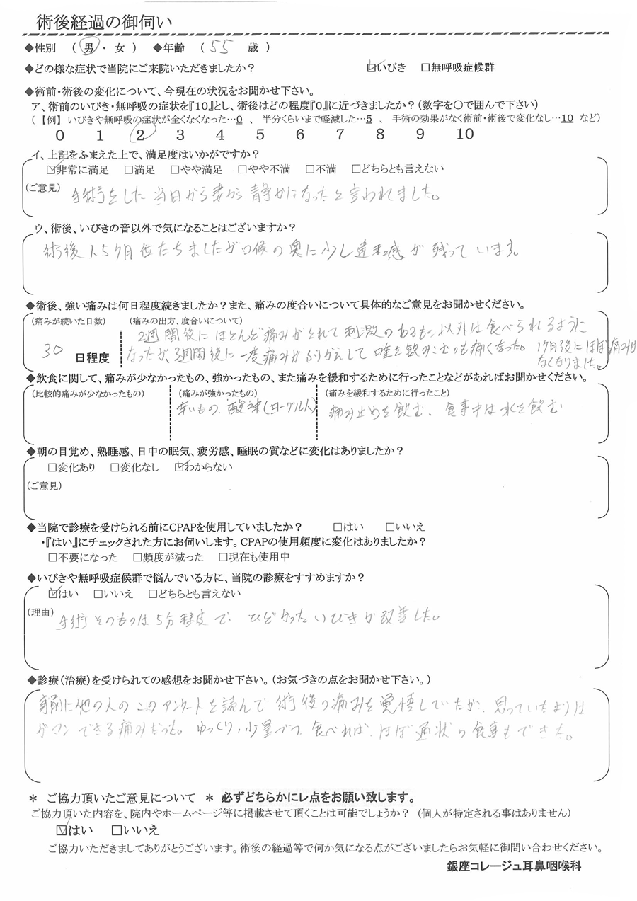 (理由)  手術そのものは5分程度で、酷かったいびきが改善した。