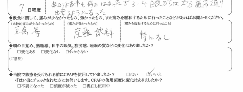 (痛みの程度について)  数日は食事も痛みがあったが、3~4日後からは大分通常通り出来るようになった。