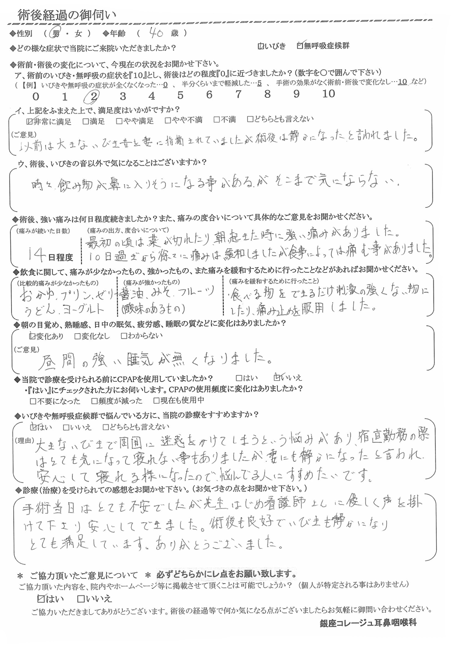 (ご意見) 以前は大きないびき音を妻に指摘されていましたが、術後は静かになったと言われました。