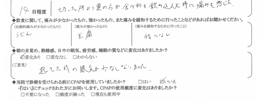 (痛みの程度について) 切った所より奥の方が、食べ物を飲み込んだ時に痛みを感じた。