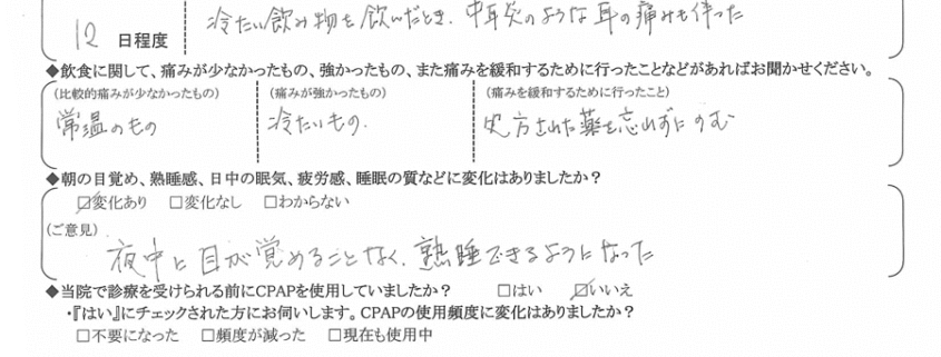 (痛みの程度について) 冷たい飲み物を飲んだ時、中耳炎のような耳の痛みも伴った。