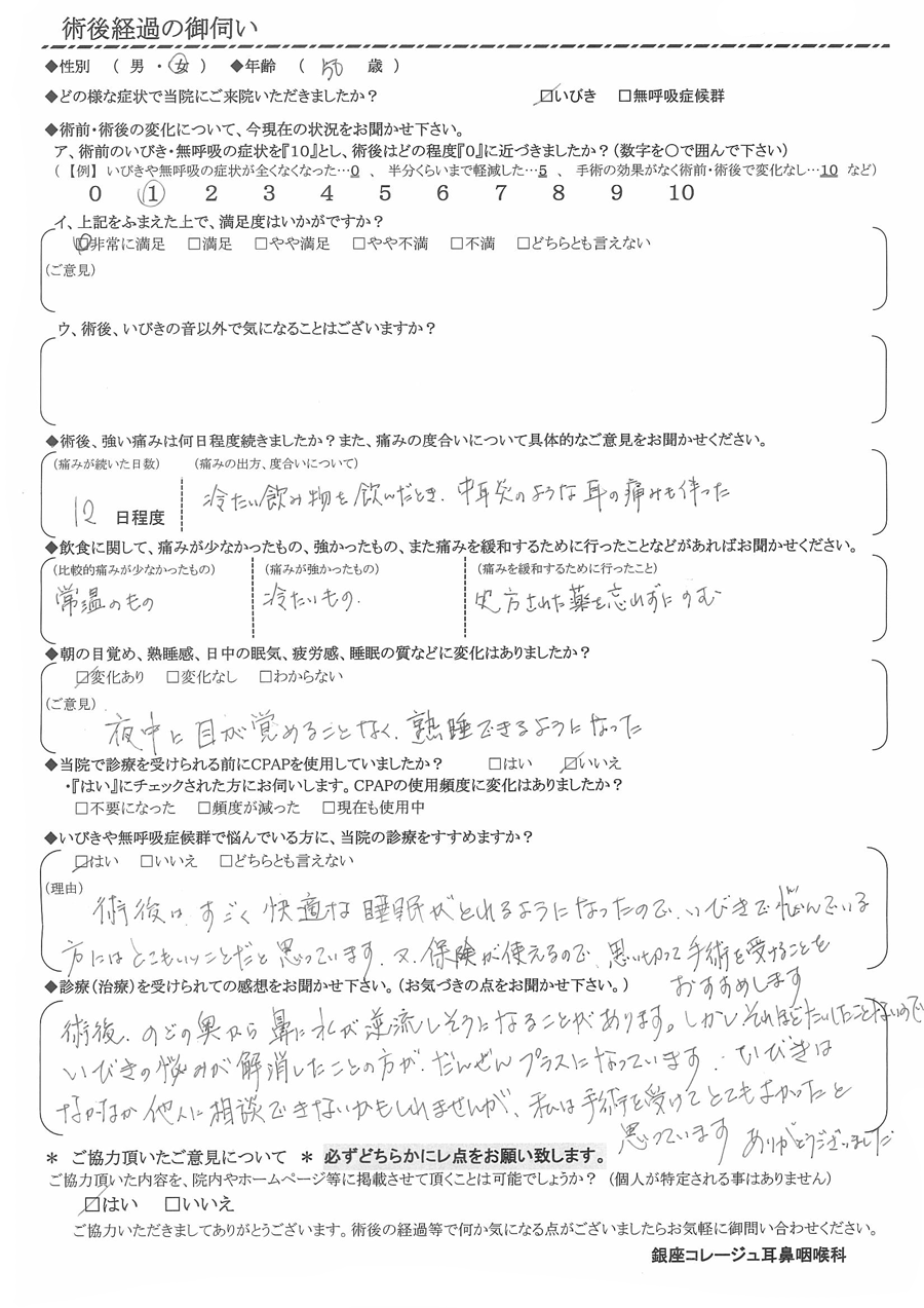 A: 術後、喉の奥から鼻に水が逆流しそうになる事があります。しかし、それほど大した事ないので、いびきの悩みが解消したことの方が断然プラスになっています。いびきはなかなか他人に相談できないかもしれませんが、私は手術を受けて良かったと思っています。ありがとうございました。