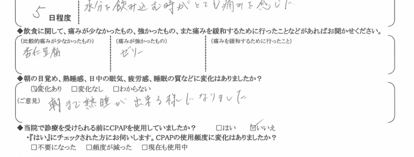 いびきがほぼなくなり、熟睡が出来るようになった事が、本当に良かった。