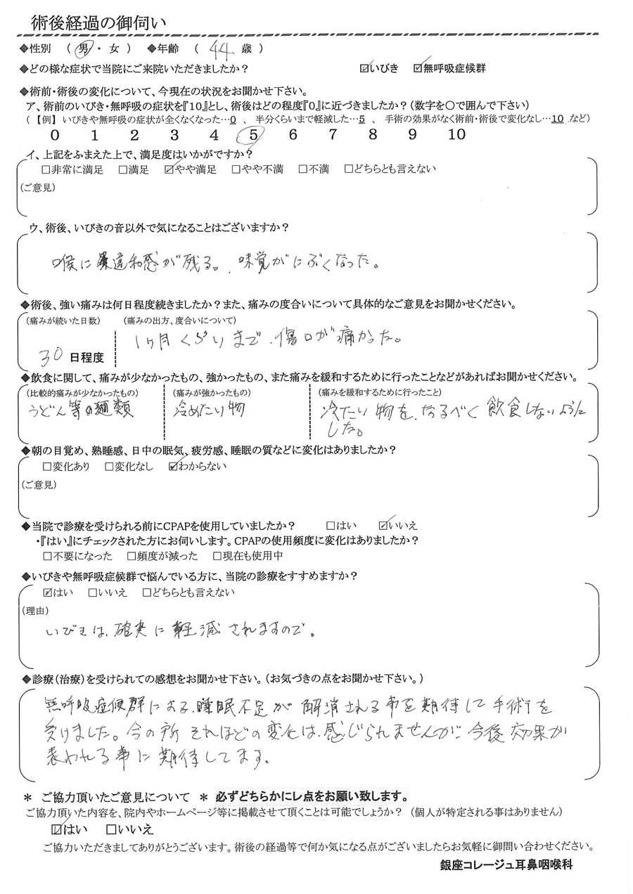 A: 無呼吸症候群による睡眠不足が解消される事を期待して、手術を受けました。今の所それほど変化は感じられませんが、今後効果が表れる事に期待しています。