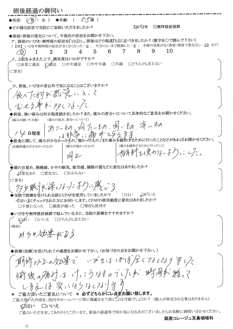 A: 期待以上の効果で、いびきはほぼ全く無くなりました。術後の痛みは結構なものでしたが、時間が経ってしまえば気にならなくなります。