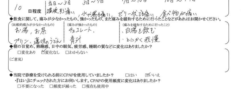(痛みの程度について) 当日~3日、唾液すら痛い。3日~7日、水や湯も痛い。7日~10日、ゼリー状でも痛い。