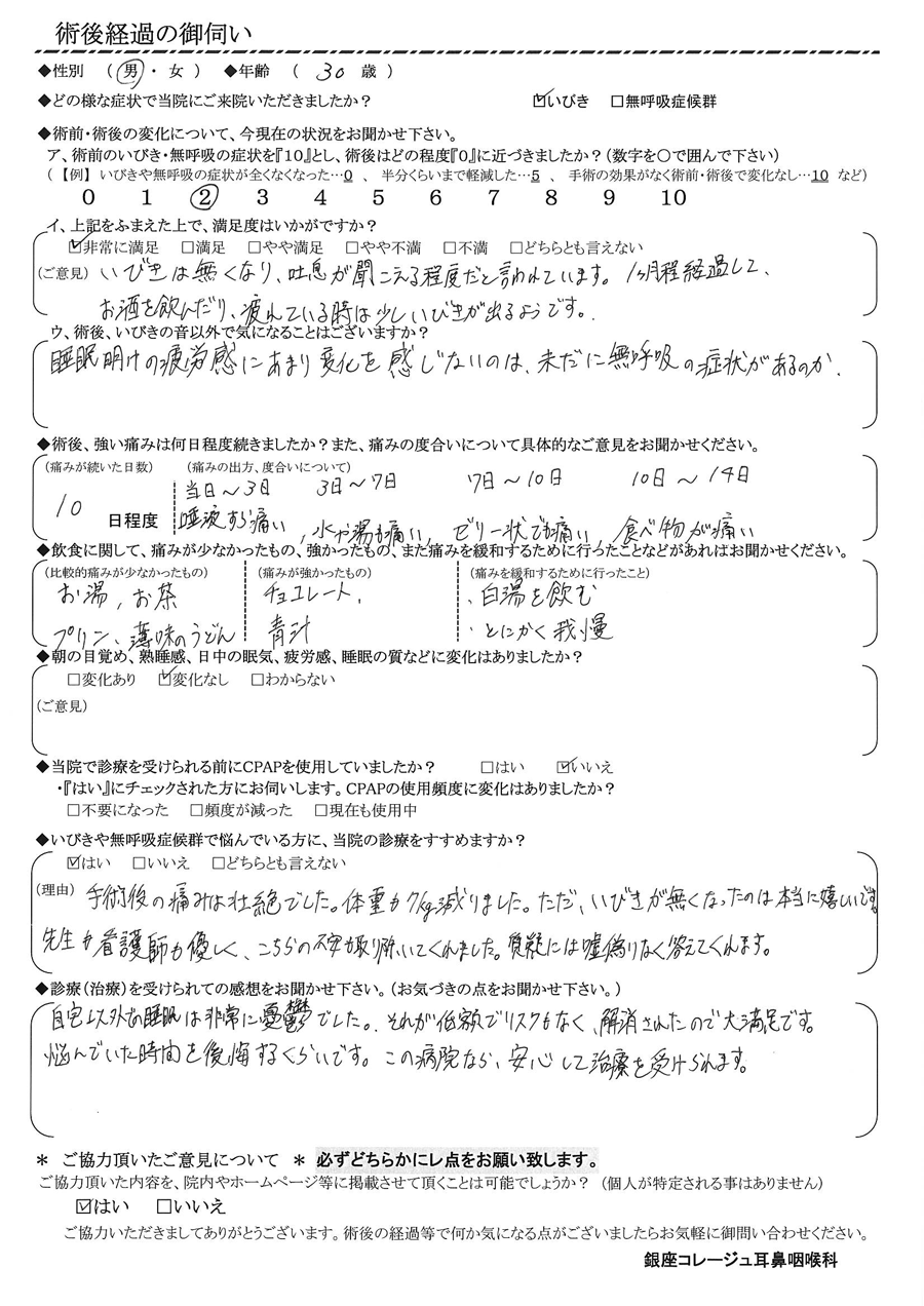 (ご意見) いびきは無くなり、吐息が聞こえる程度だと言われています。1ヶ月経過して、お酒を飲んだり、疲れている時は少しいびきが出るようです。