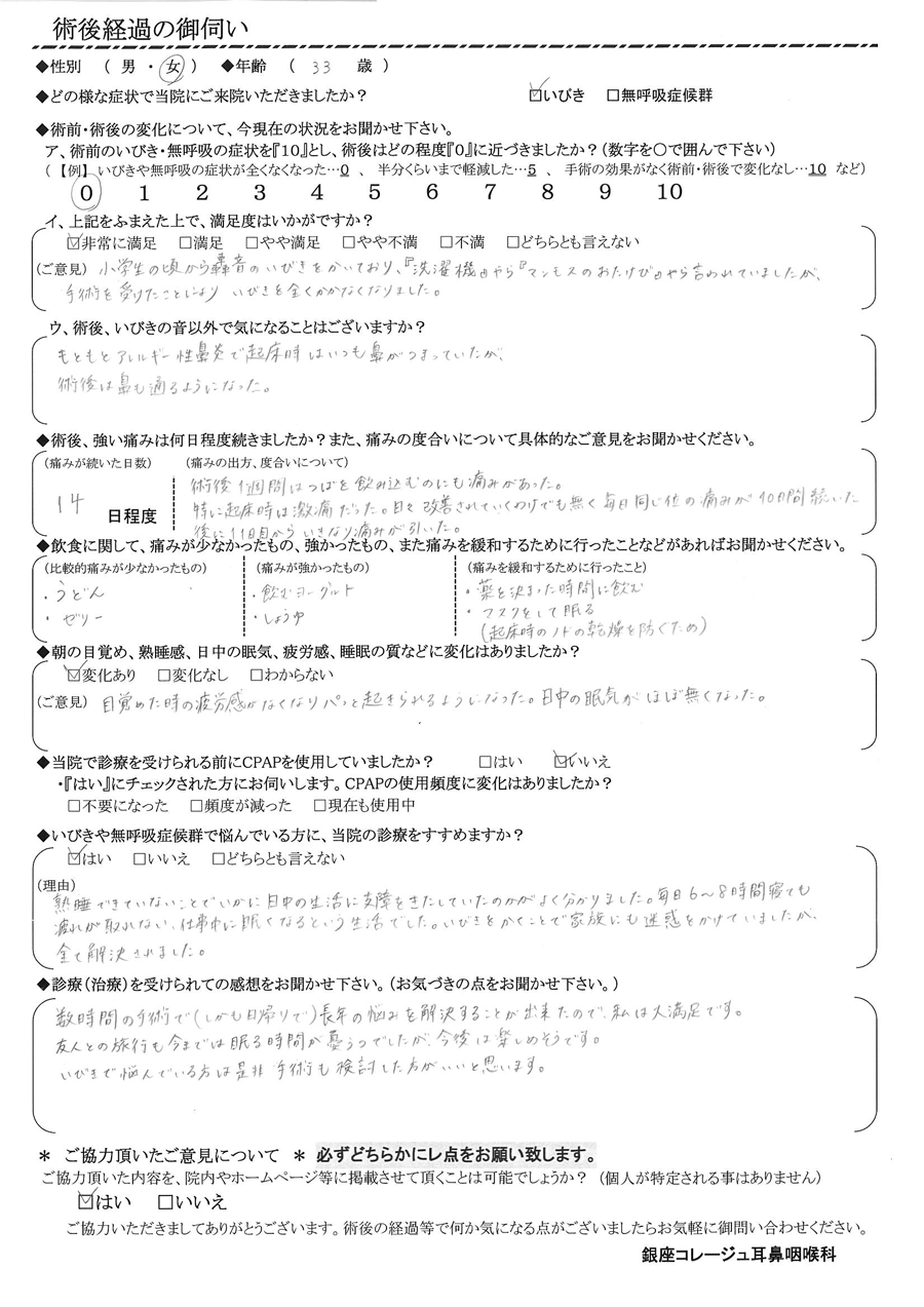 A: 数時間の手術で(しかも日帰り)長年の悩みを解決する事が出来たので、私は大満足です。友人との旅行も今までは眠る時間が憂鬱でしたが、今後は楽しめそうです。いびきで悩んでいる方は是非、手術も検討した方が良いと思います。