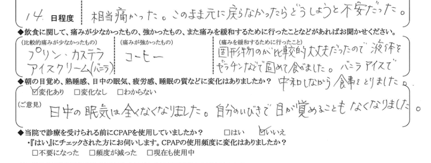 (ご意見) 日中の眠気は全く無くなりました。自分のいびきで目が覚めることも無くなりました。