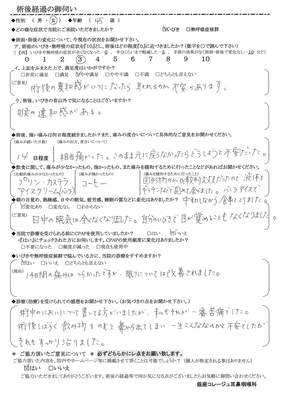 (ご意見) 日中の眠気は全く無くなりました。自分のいびきで目が覚めることも無くなりました。