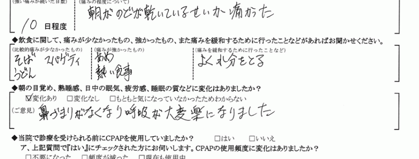 (ご意見)術前は、まるで「ガーガー」よ叫んでいるようで、家族にも迷惑をかけていましたが、術後は寝息くらいと言われ安心しました。
