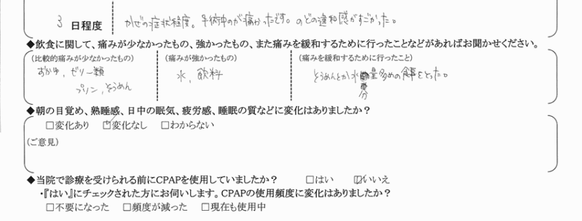 (理由) 痛かったけど、前に比べたら大分いびき音が小さくなったので、やって良かったなと思います。