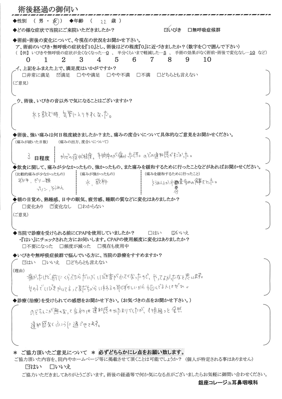 (理由) 痛かったけど、前に比べたら大分いびき音が小さくなったので、やって良かったなと思います。