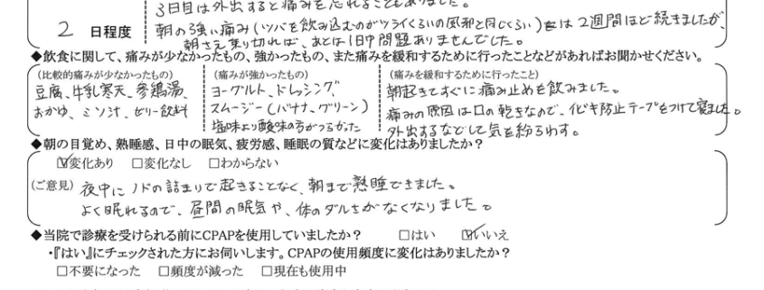 (理由)  長年のイビキで昼間の眠気や体の重さが当たり前の事として過ごしていましたが、ハッキリと変化が現われたので、とても体が軽くなりました。