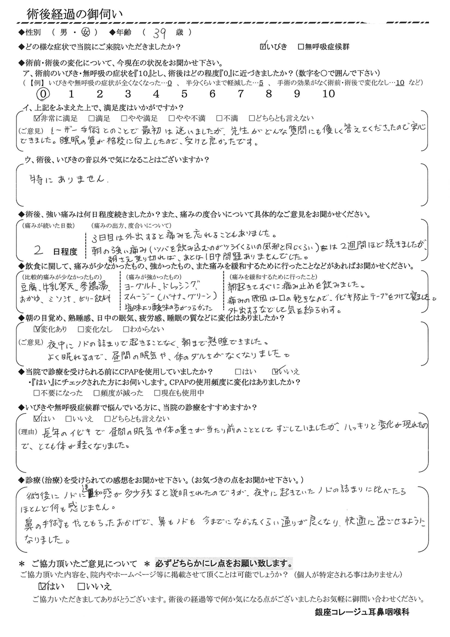 (ご意見) レーザー手術との事で最初は迷いましたが、先生がどんな質問にも優しく答えて下さったので安心して出来ました。睡眠の質が格段に向上したので、受けて良かったです。