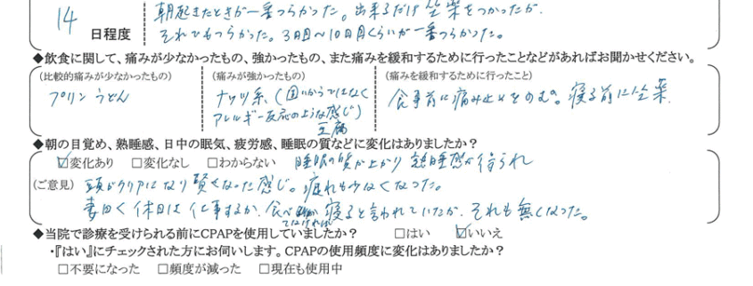 (ご意見) 睡眠の質は向上し、起床時の頭痛が減った。初めは妻が驚くぐらい静かになったが、最近また少しイビキが出てきている。精神的に安定したように思う。