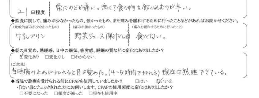(ご意見) 当時、痛み止めが切れると目が覚めた。(4~5時間で切れる)現在は熟睡できている。