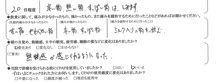 (痛みの程度について) 辛い物、熱い物、すっぱい物はしみます。