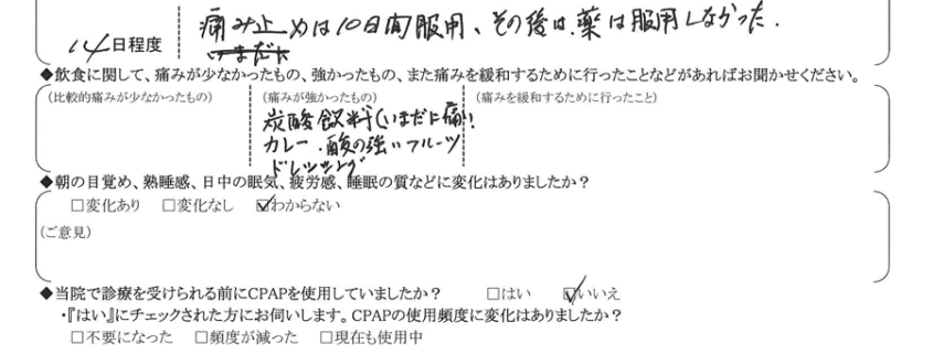 (痛みの程度について) 痛み止めは10日間服用。その後は薬は服用しなかった。