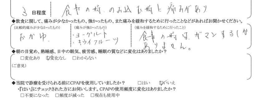 A:(痛みを緩和するために行ったこと) 食事の時はガマンするしかありません。
