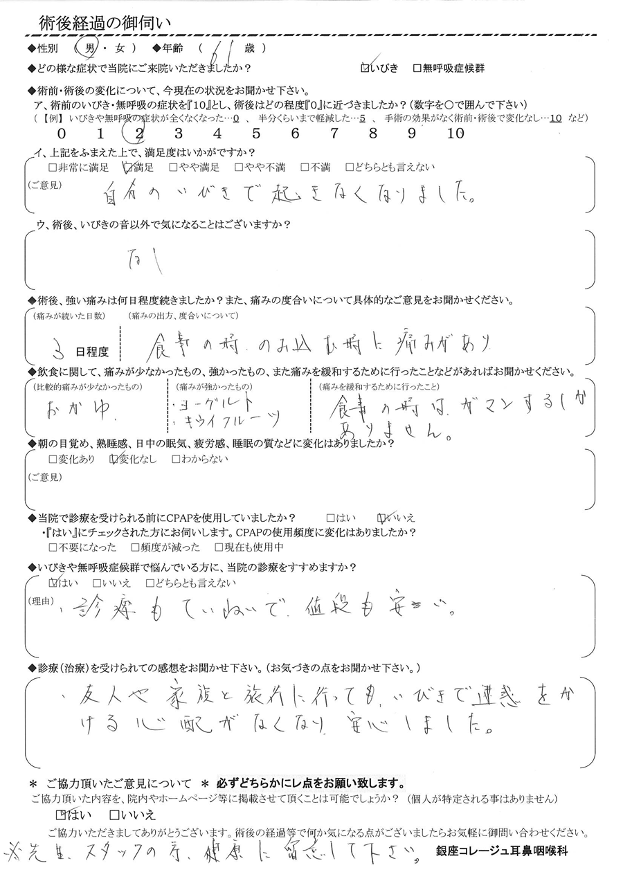 A:友人や家族と旅行に行っても、いびきで迷惑をかける心配がなくなり、安心しました。※先生、スタッフの方、健康に留意してください。