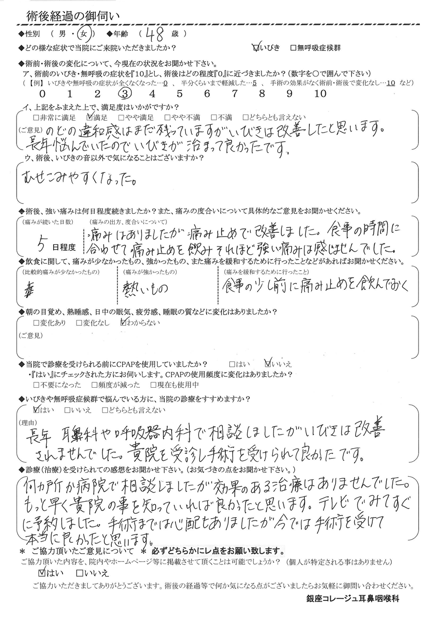 (ご意見) 喉の違和感はまだ残っていますが、いびきは改善したと思います。長年悩んでいたので、いびきが治まって良かったです。