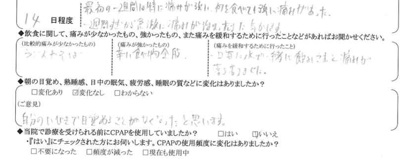 (痛みの程度について) 最初の1週間は特に痛みが強い。何を食べても強い痛みがあった。1週間過ぎから球液に痛みが治まった気がします。