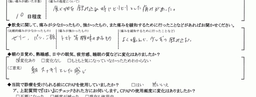 A:術後、2日間はそれほど痛みもなく苦しくなかったが、3日目から痛みがひどくなり、飲み込むのが苦痛になった。