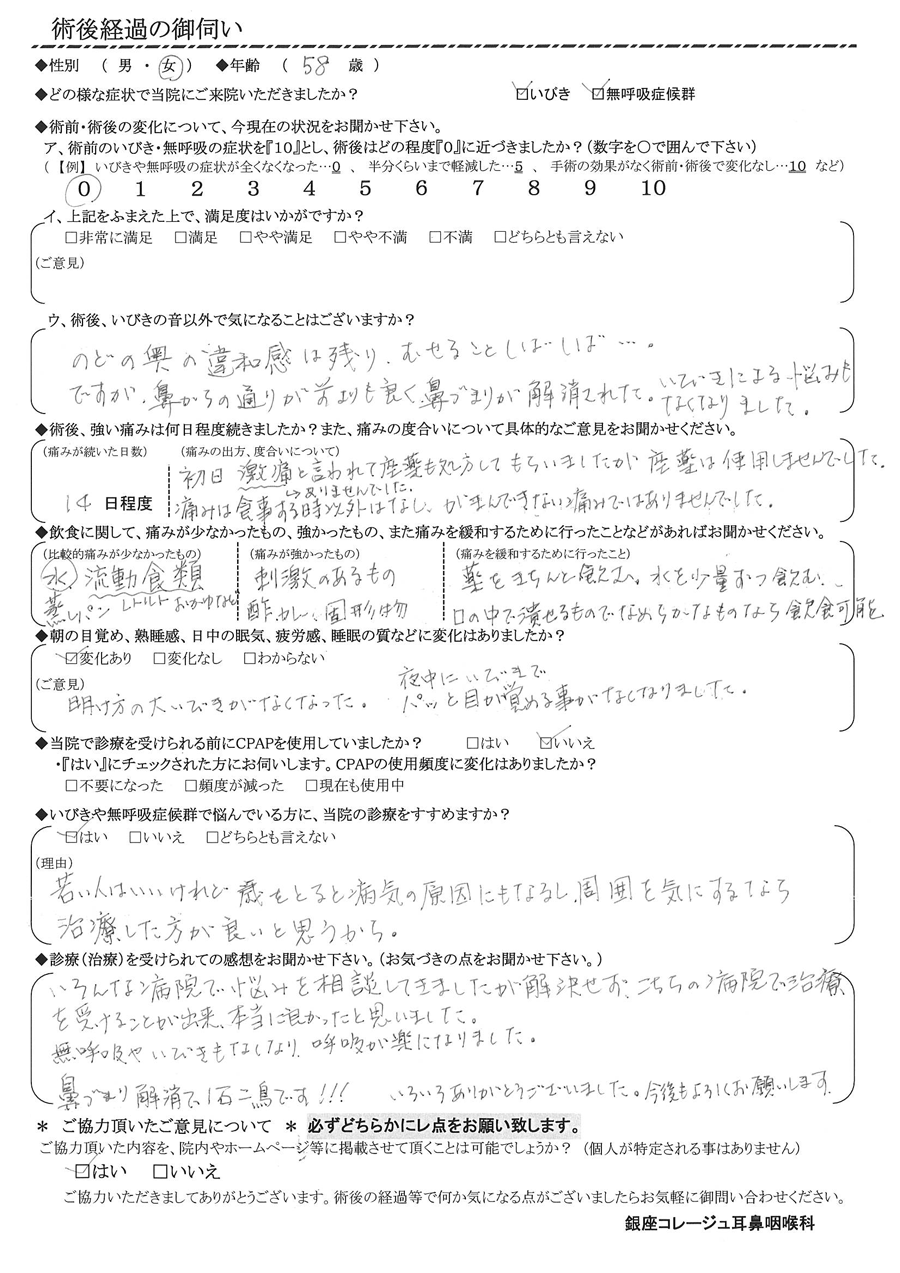 A: 色んな病院で悩みを相談してきましたが、解決せず、こちらの病院で治療を受ける事が出来、本当に良かったと思いました。無呼吸やいびきも無くなり、呼吸が楽になりました。鼻づまり解消で一石二鳥です!!!