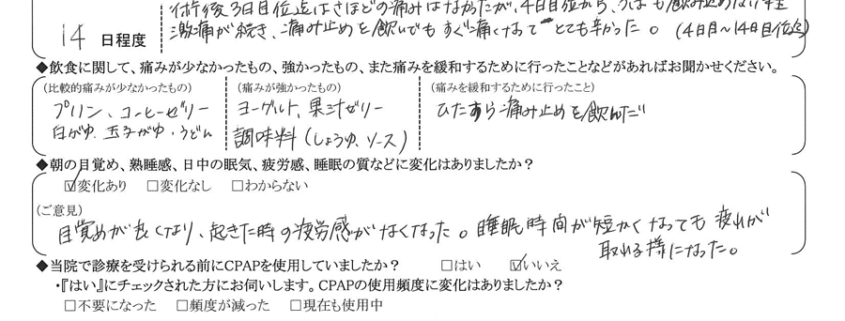 (ご意見) 起きた時の疲れ具合が術前よりかなり良くなった。家族にいびきで迷惑をかけなくなった。