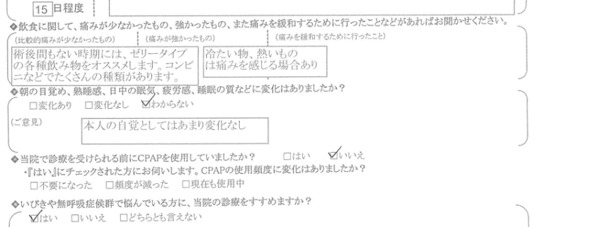 (ご意見) ①無呼吸症状については、術後ほぼ改善されたようです。