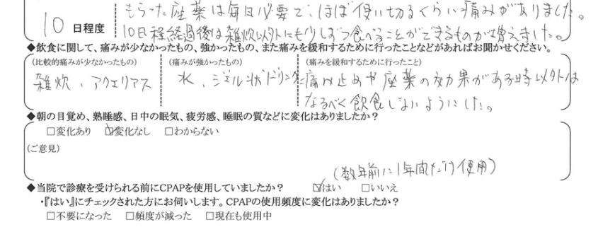 (痛みの程度について) 貰った座薬は毎日必要で、ほぼ使い切るくらい痛みがありました。10日程経過後は雑炊以外にも少しずつ食べる事が出来る物が増えました。