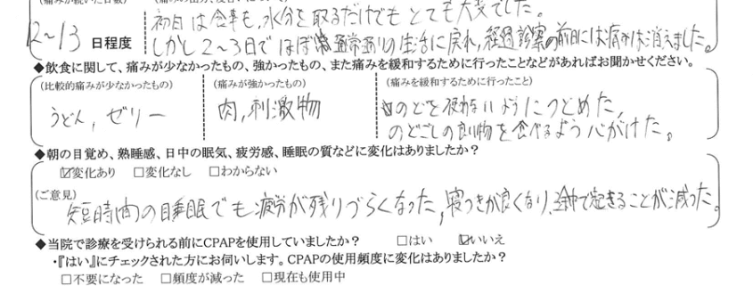 (痛みの程度について) 初日は食事も水分を摂るだけでもとても大変でした。しかし、2~3日でほぼ通常通りの生活に戻れ、経過診察の前日には痛みは消えました。