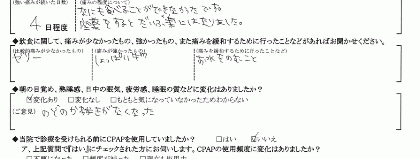A: (痛みを緩和するために行ったこと)痛みの強い時はプリン・ゼリーを食べた。