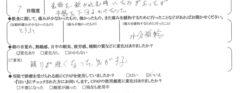 (痛みの程度について) 食物を飲み込むとき痛みがあったが、予想を下回るものだった。