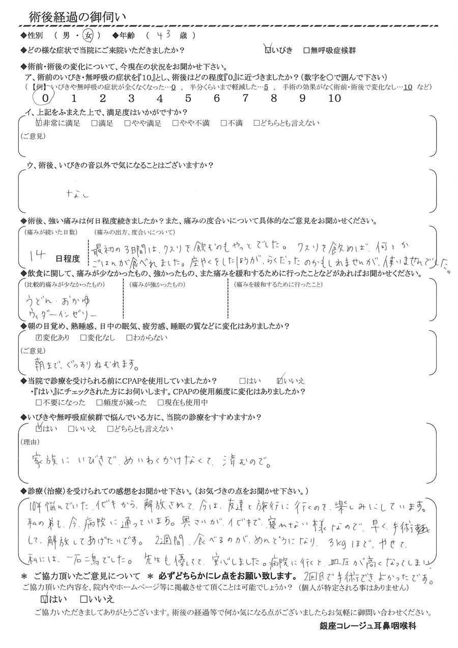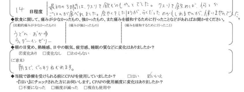 A: 10年悩んでいたイビキから解放されて、今は友達と旅行に行くのを楽しみにしています。私の弟も今、病院に通っています。奥さんがイビキで寝れない様なので。早く手術して、解放してあげたいです。2週間、食べるのが面倒になり3㎏ほど痩せて、私には一石二鳥でした。先生も優しくて安心しました。病院に行くと血圧が高くなってしまい、2回目で手術でき、良かったです。