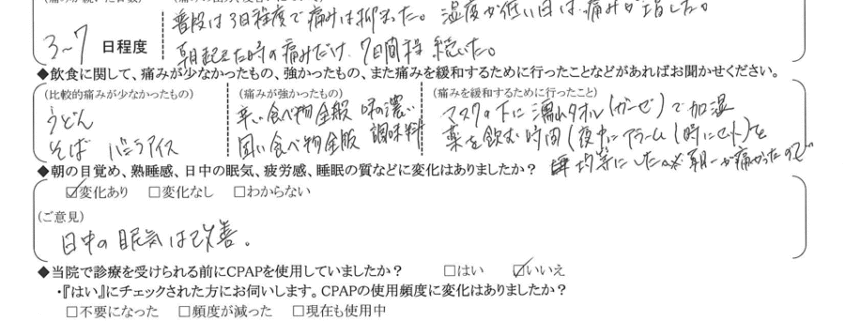 (痛みの程度について) 普段は3日程度で痛みは治まった。湿度が低い日は、痛みが増した。朝起きた時の痛みだけで、7日間ほど続いた。