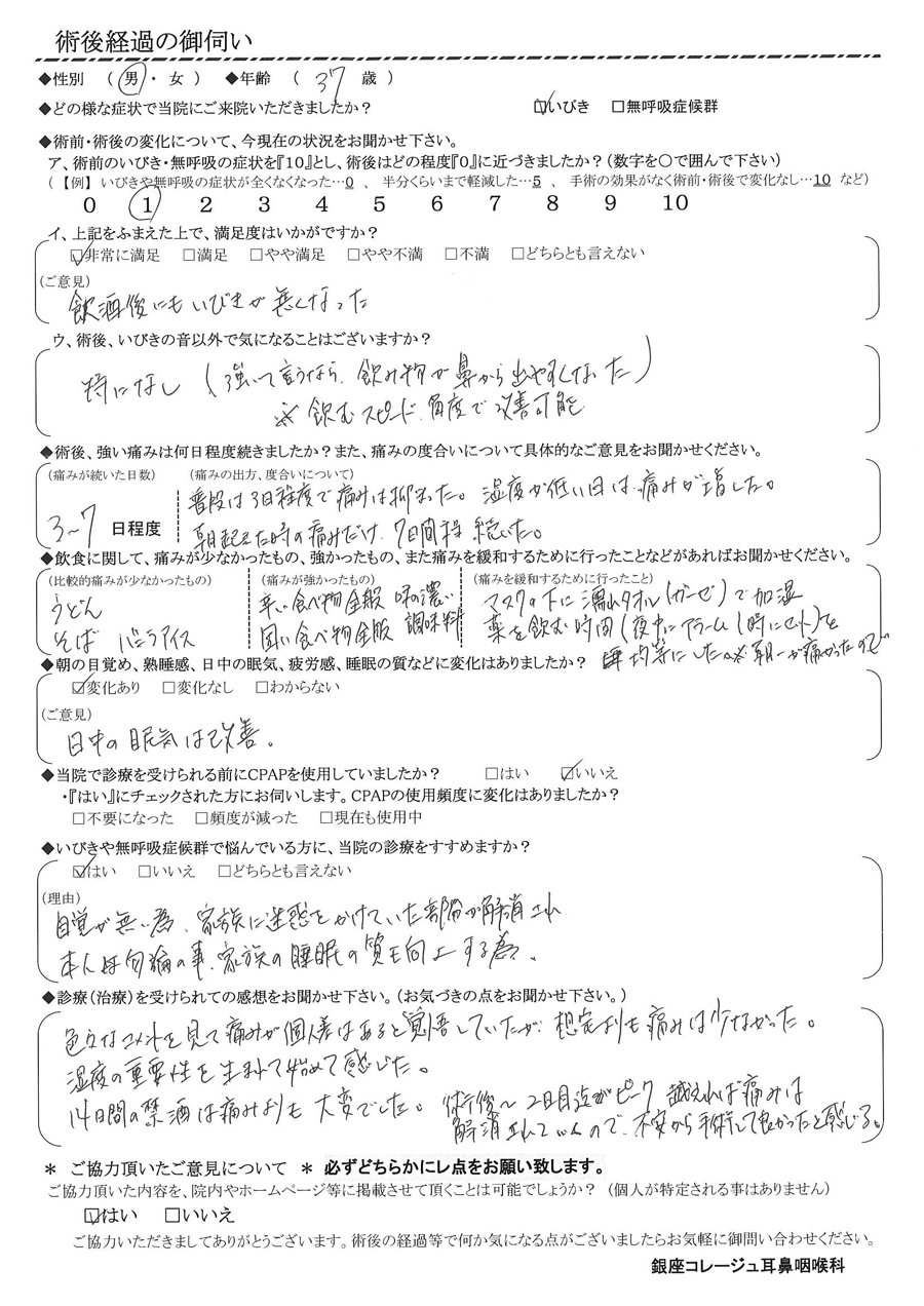 ア, 術前のいびき・無呼吸の症状を『10』だったとすると、術後はどの程度になりましたか? 【1】