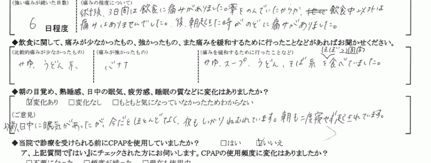 A: (痛みの程度について) つばを飲みこむのも当初は辛かったが、10日程度で低減しました。