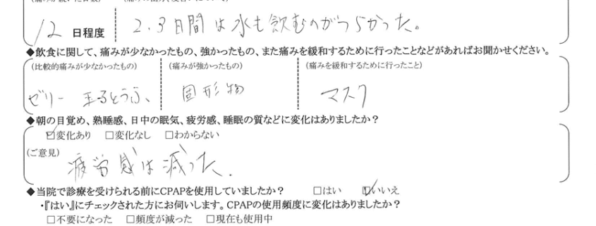 (痛みの程度について) 2・3日は間は水も飲むのが辛かった。