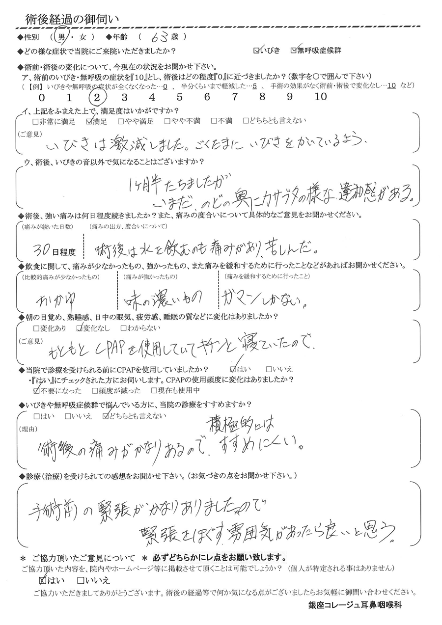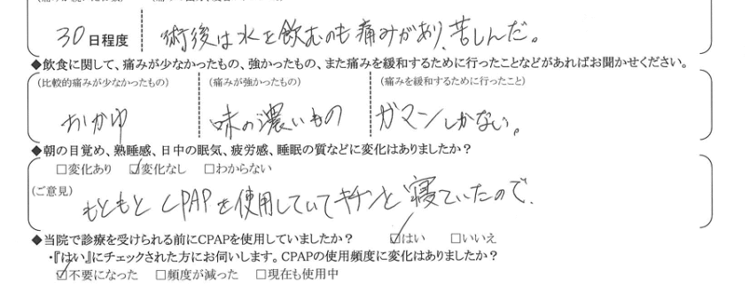 (痛みの程度について) 術後は水を飲むのも痛みがあり、苦しんだ。