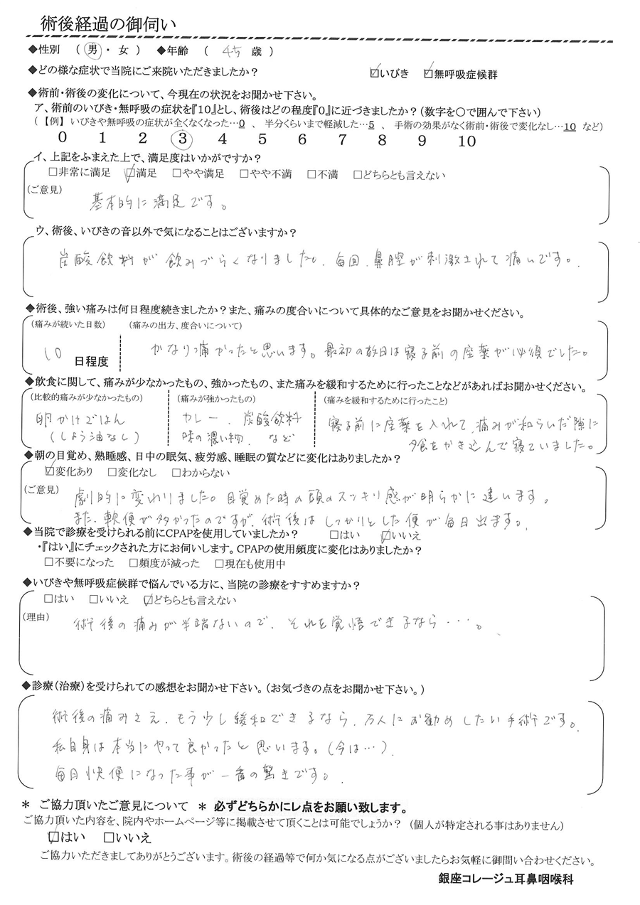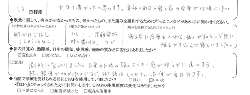 (ご意見) 劇的に変わりました。目覚めた時の頭のスッキリ感が明らかに違います。また、軟便が多かったのですが、術後はしっかりとした便が毎日出ます。