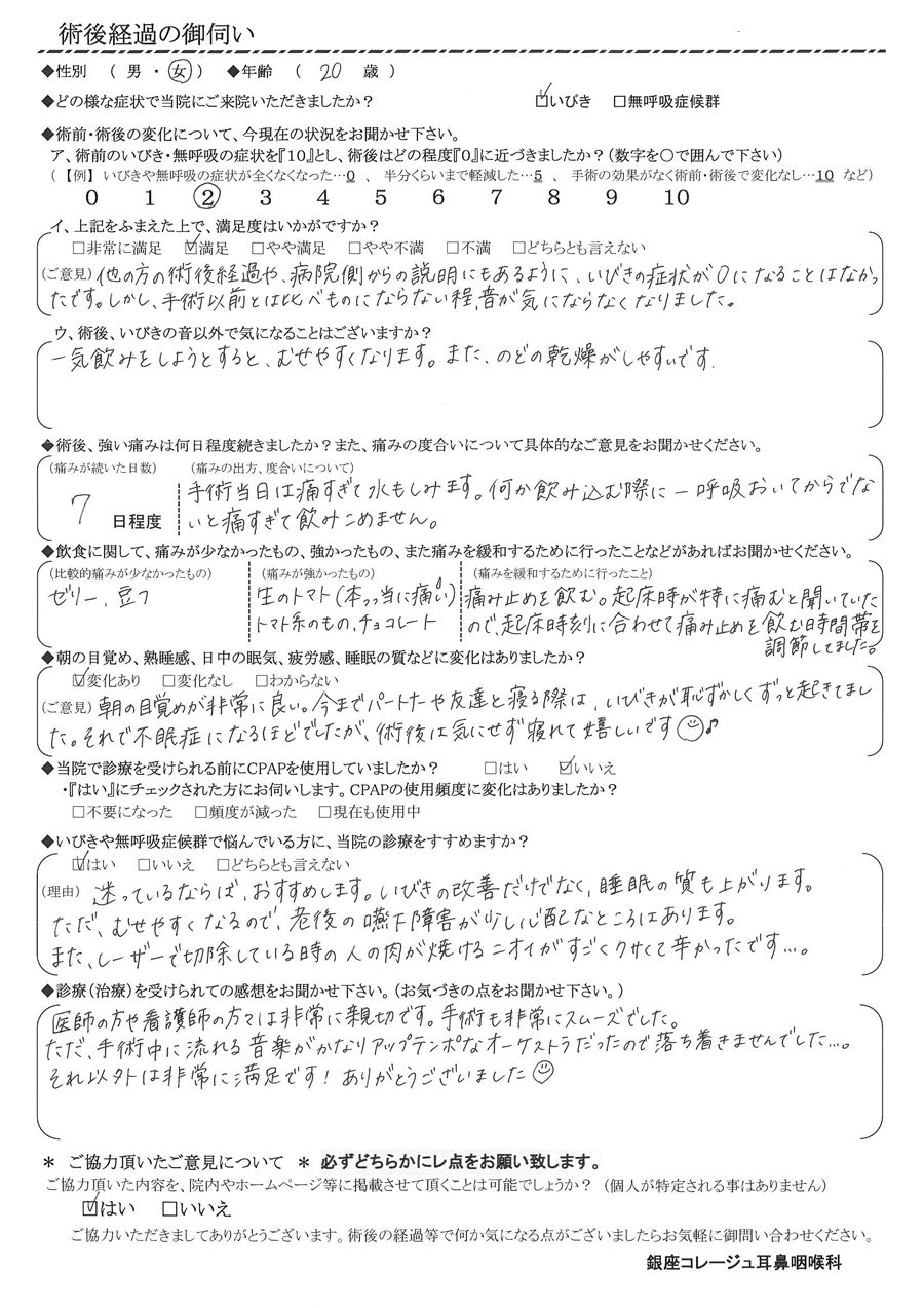 (ご意見) 他の方の術後経過や、病院側からの説明にもあるように、いびきの症状0になる事は無かったです。