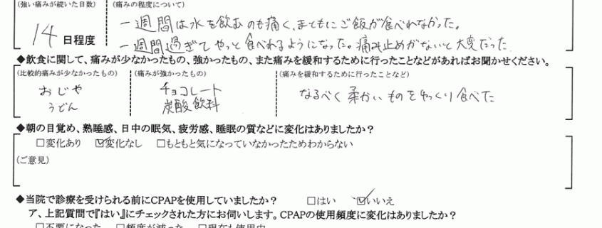 A: (痛みの程度について)1週間程度は強い痛み(ズキズキ)だったがその後は徐々に楽になってきた