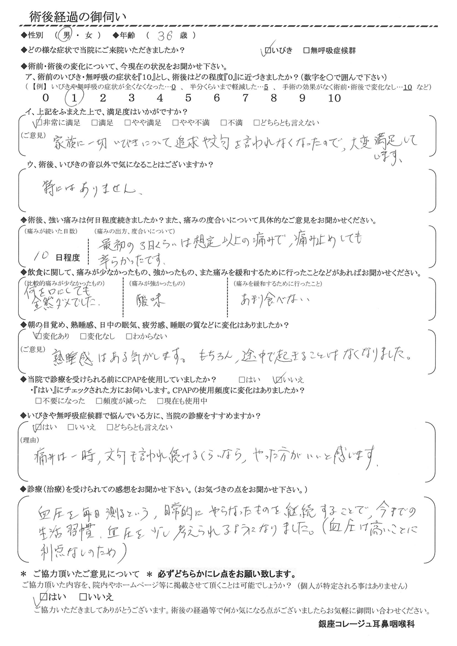 (ご意見)  家族に一切イビキについて追及や文句を言われなくなったので、大変満足しています。