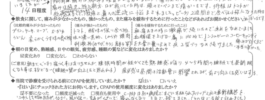 (理由) CPAPはフィリップス製で40万円位すると聞きましたが、全然使い物にならなくて、タダでも使いたくないです。常に空気が送り込まれるので,溺れた様な感覚になり、眠れません。都筑先生は鼾治療の世界的名医だと思うし、実績も類を見ない程断トツなので信頼して手術を受けました。鼾も鼻詰まりも50年以上悩まされてきたので手術しかないと言う気持ちになれて、術後は思ったより快適で本当に院長先生には感謝しております。7ヶ月間もの長きに渡り有り難うございました。