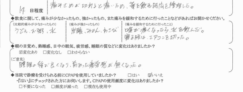 (痛みの程度について) 痛み止めが切れると痛いため、薬を飲む時間を管理した。