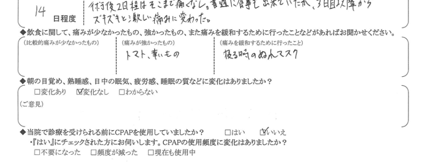(痛みの程度について) 術後2日程はそこまで痛くない。普通に食事もできていたが、3日目以降からズキズキと激しい痛みに変わった。