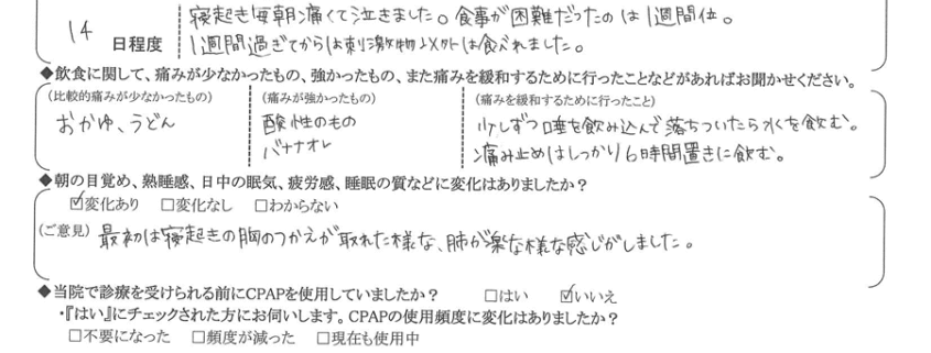 (痛みの程度について) 寝起き、毎朝痛くて泣きました。食事が困難だったのは1週間位。1週間過ぎてからは刺激物以外は食べれました。