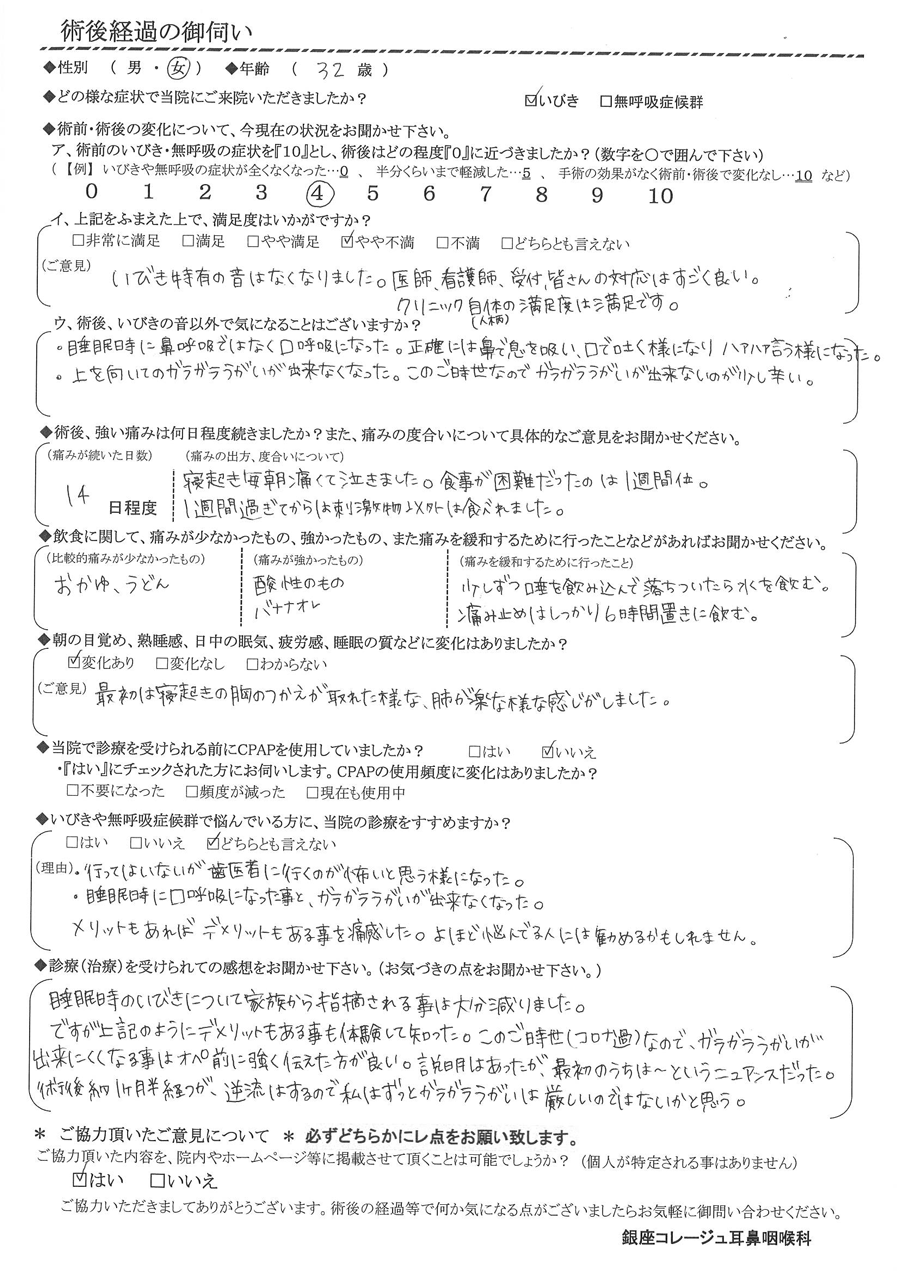 (ご意見) いびき特有の音は無くなりました。医師・看護師・受付、皆さんの対応は凄く良い。クリニック自体(人柄)の満足度は満足です。